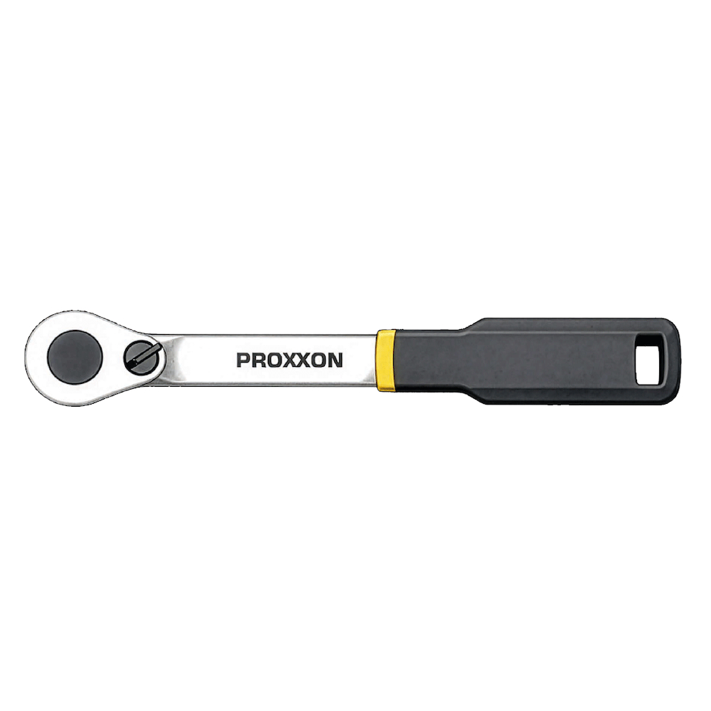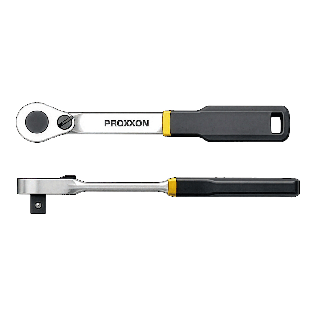 Clichetul SlimLine 1/2" Proxxon este ideal pentru lucrări în spații restrânse, datorită construcției cu profil foarte subțire, care permite acces facil în zone greu accesibile. Mecanismul de înaltă precizie, cu 90 de dinți, asigură transmiterea eficientă a unui cuplu ridicat și permite lucrul fin chiar și în condiții dificile. Schimbarea sensului de rotație se realizează rapid, prin intermediul levierului integrat. Fabricat din oțel CrV de înaltă calitate, cu finisaj dublu nichelat și cromat mat, clichetul oferă rezistență ridicată la uzură. Mânerul ergonomic din TPR este rezistent la uleiuri și acizi și asigură o prindere sigură în timpul utilizării.