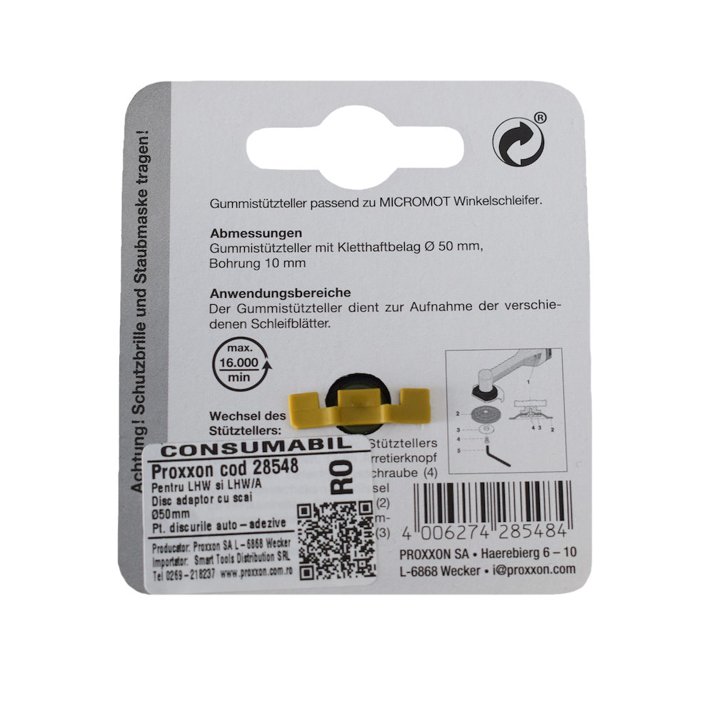 Discul adaptor Proxxon 28548 este un accesoriu esențial, conceput pentru a extinde funcționalitatea polizoarelor unghiulare Proxxon LHW și a mașinilor de lustruit Proxxon WP/E (sau variantele lor cu acumulator, LHW/A și WP/A).