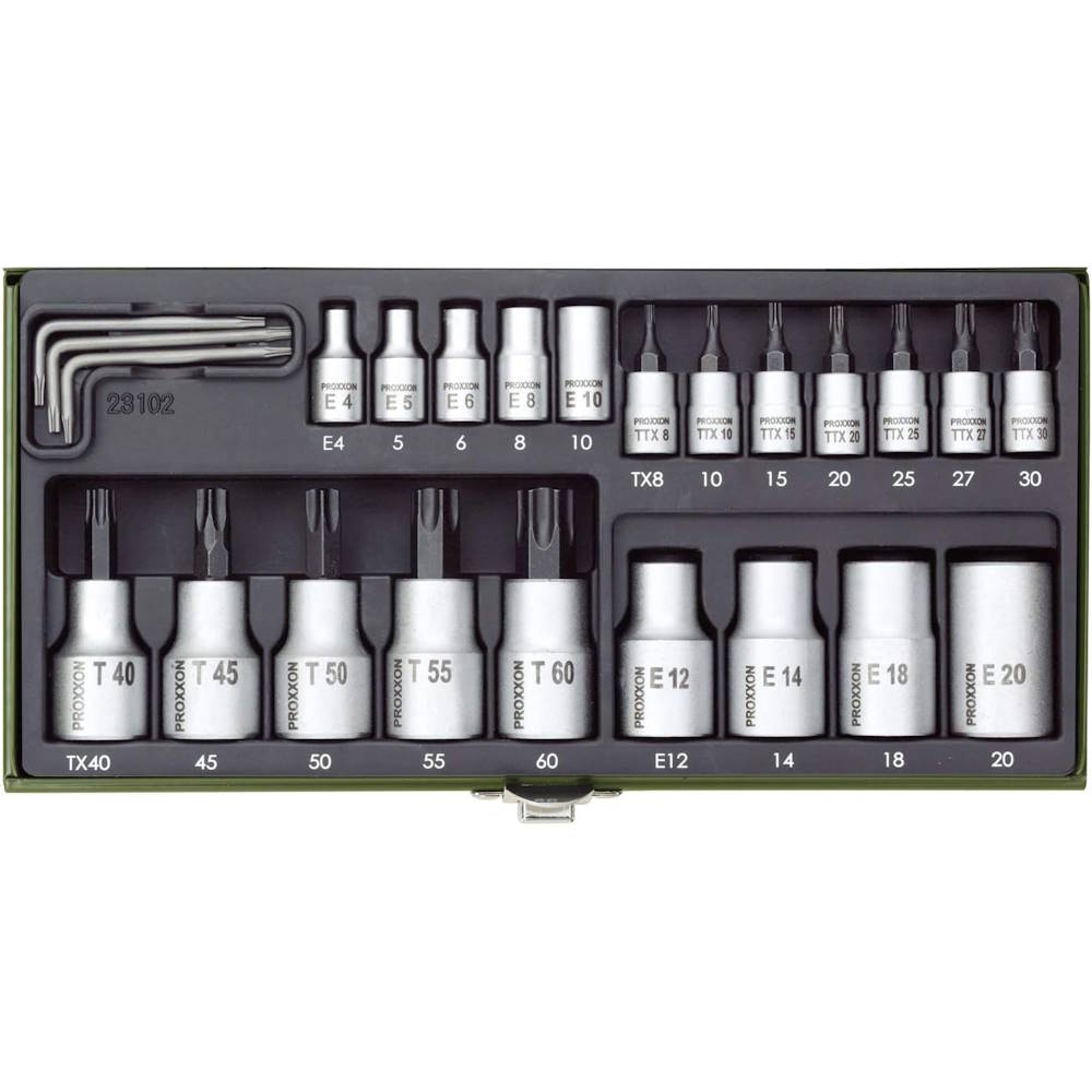 Trusă specială pentru şuruburile TORX, 24 piese. Cu pătrate de antrenare de 1/4" şi 1/2".